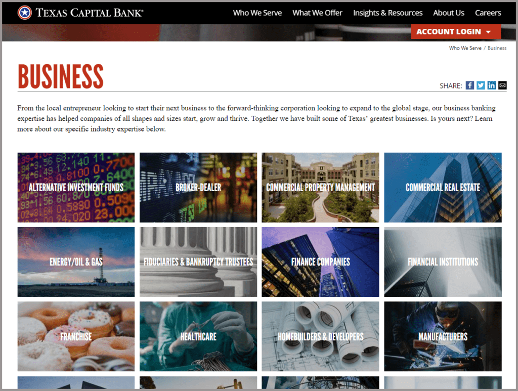 Talk about personality! This banking website has it. There is no mistaking that Texas Capital Bank is firmly rooted in Texas and serves its user’s specific needs. The imagery is strong and with clear concise messaging. It’s easy to see their content is personalized and resonates with their target audience. They have a landing page that lists 20 categories of businesses they have helped to grow broken down by industry. This page is simply laid out and helps the visitor find the area of expertise they are looking for.