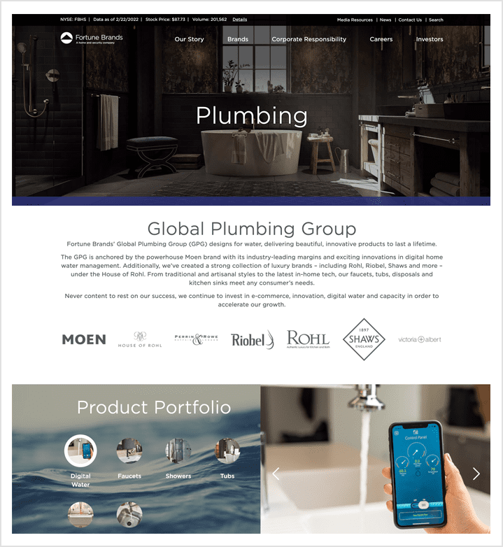 Fortune Brands hired Wakefly to redesign and develop their new corporate website. Fortune Brands is a home and security consumer products company. They began trading on the New York Stock Exchange following their spin-off from Fortune Brands, Inc. (NYSE: FO) on October 4, 2011. Today, Fortune Brands is a Fortune 500 company and part of the S&P 500 Index. Their companies brand portfolio is made up of three distinct categories, cabinets, plumbing and outdoors & security.