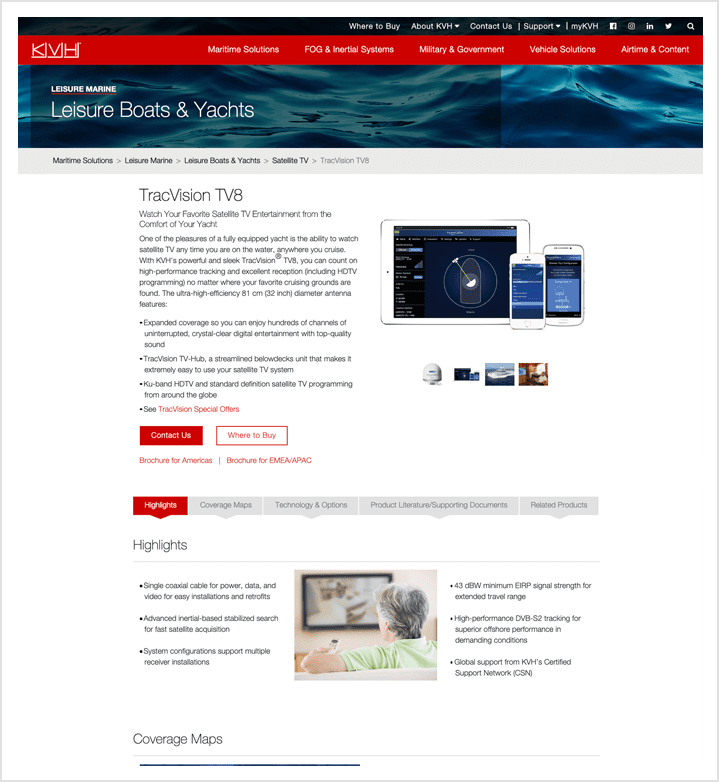 KVH approached Wakefly seeking a partner to perform a complete overhaul of their very outdated website using Sitecore as the content management platform. Not only was the website in need of a technical upgrade, but the visual representation of the brand also needed a refresh. Wakefly engaged in a multi-year project, beginning with persona development, corresponding wireframes and sitemap strategy, all the way through to design and development.