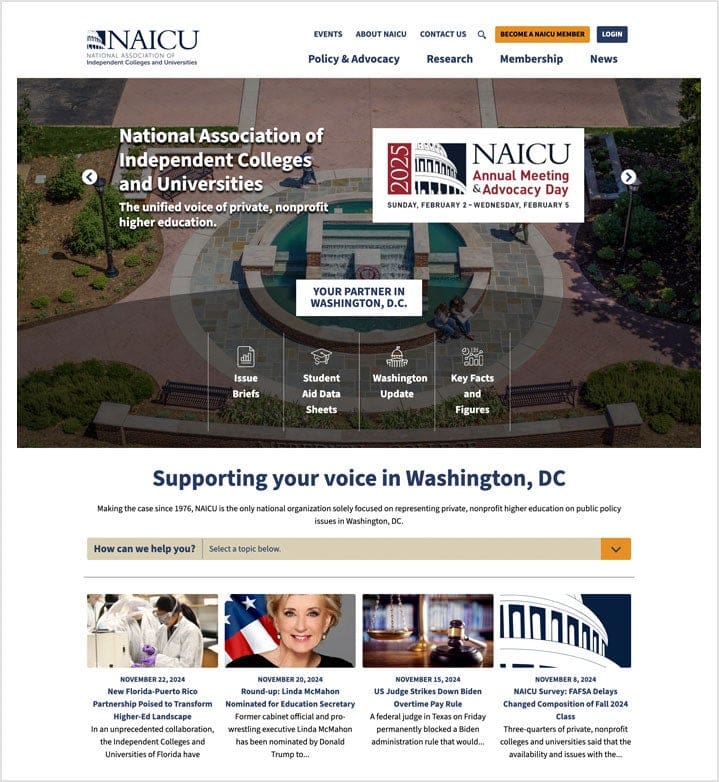 Key project objectives included enhancing usability through intuitive navigation and improved content organization, ensuring users could easily access relevant information. Wakefly also increased the visibility and frequency of calls to action, encouraging greater user interaction. To modernize the design, the website was given a clean, professional aesthetic that aligned with NAICU’s mission of supporting independent higher education institutions. Additionally, the content management process was streamlined using Umbraco’s customizable CMS, reorganizing and restructuring the content and website search to make it easier for users to find information. The Umbraco platform empowered NAICU’s internal team to manage and update the website with minimal technical expertise.